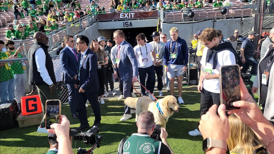 Soon, it was time to head into the Rose Bowl itself. As surreal as it was, we were led past a large iron gate and into the tunnel, past the Oregon Ducks locker room, and out onto the iconic Rose Bowl grass. The players were warming up just yards away, and we could hardly contain our excitement. While mingling with ESPN’s College Football Talent, including Rece Davis, Holly Rowe, Stormy Buonantony, and Kirk Herbstreit, I couldn’t resist snapping a few photos—though I’ll admit that Peter, the beautiful dog accompanying the crew, got most of my attention!