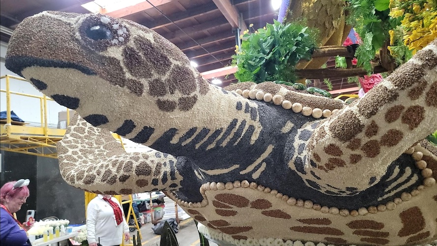Cristina Callahan-Parker, a longtime Tournament of Roses official, gave us fascinating insights into the float designs. She explained that the float framework must be covered with organic materials—these can’t be dyed or painted but can be cut, split, mashed, or pureed. The air was rich with various fragrances, in fact it was the sense of smell that helped us identify the coffee used on the horses of the Heartland float. She also pointed out the spaces for the drivers and explained the teamwork involved within that process given the limited visibility. As we weaved through the bustling, sometimes chaotic float-decorating area, we had to watch our step, being careful not to bump into the floats or accidentally knock off any delicate blooms.