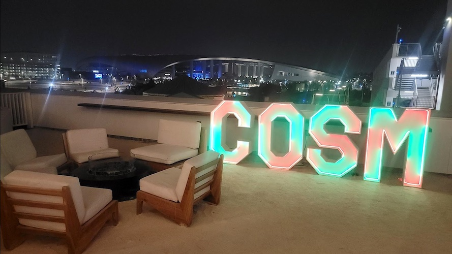 That evening, after a quick refresh and lunch on our own, we headed downtown for the Fiesta Bowl at Cosm LA, nestled between the Intuit Dome and SoFi Stadium. Cosm is an incredible venue, featuring a massive, immersive dome-shaped screen that made us feel like we were right in the middle of the game at State Farm Stadium in Glendale, Arizona. With comfortable lounge seating, delicious food like birria tacos and wild mushroom flatbreads, and a full bar, it felt like being at the game without the crowds and Arda was a masterful host keeping everyone engaged in the fun. There were even sign-making stations and t-shirt tosses by staff to get us in the spirit.