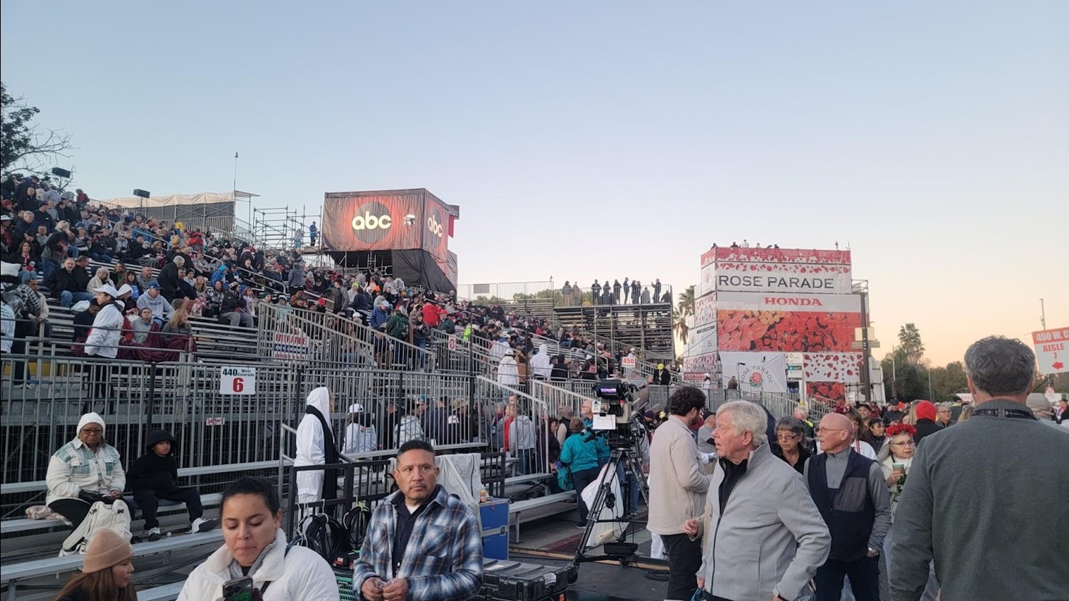 Finally, New Year’s Day arrived, and as is often the case in Pasadena, the weather was perfect. We boarded our motorcoach in the darkness of early morning, escorted by police along Colorado Blvd, which would soon become the Rose Parade route. We were seated in prime spots near the corner of Orange Grove and Colorado, so close to the parade that we could hear and exchange New Year’s greetings with the parade participants. Our seats also provided a perfect vantage point for TV cameras, and we later learned that some of our families spotted us on the broadcast.