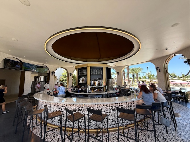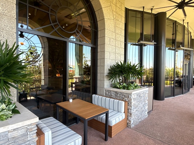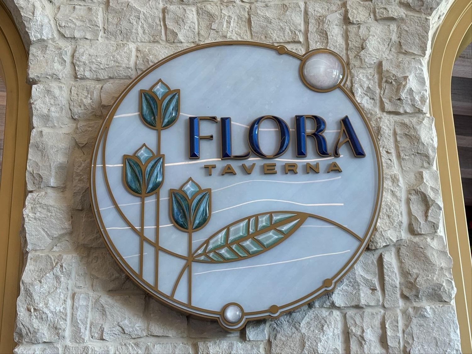 Just to the left of the check in area, Flora Taverna provides a full-service dining experience that is set to continue the hotel's Mediterranean inspiration with breakfast, lunch and dinner menus. The open-kitchen style restaurant features live cooking stations, pizza ovens, grills, and a gyro station. Flora Tavern embraces natural lighting in the same fashion as the lobby, with large windows providing a warm and airy atmosphere as guests get to enjoy the sprawling scenery of Epic Universe. As the name suggests, the restaurant features plenty of plant decor as well as an outdoor dining area right up against the park.