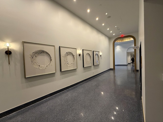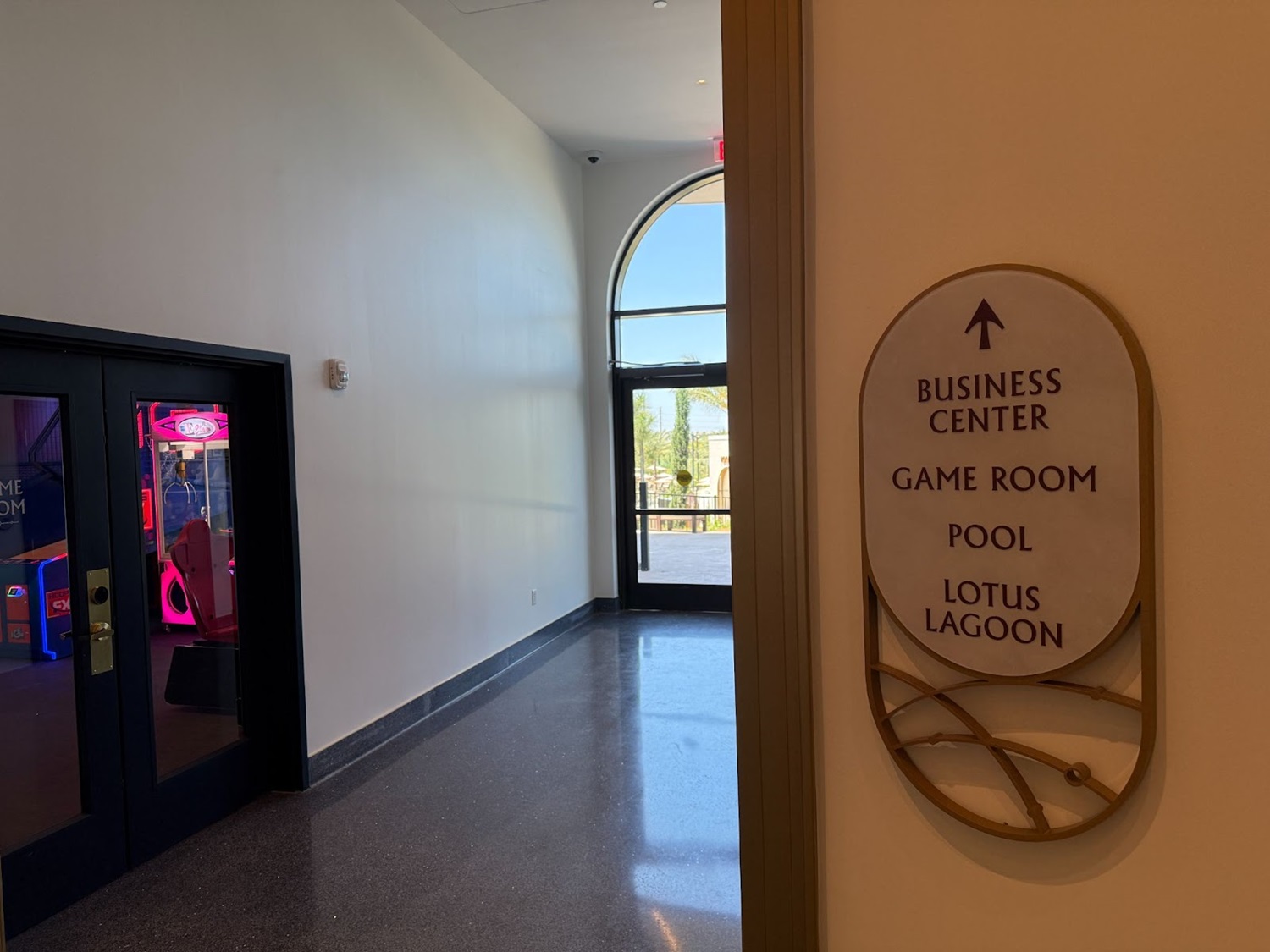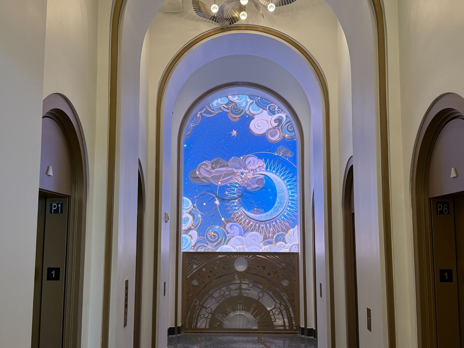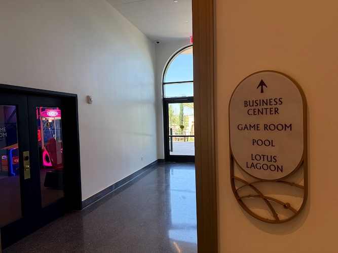 Continuing to the right towards the hotel’s pool area, guests will encounter an ornate elevator area, lots of celestial inspired art, a fitness center, and a game room.