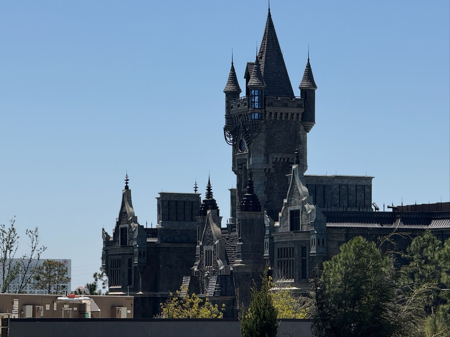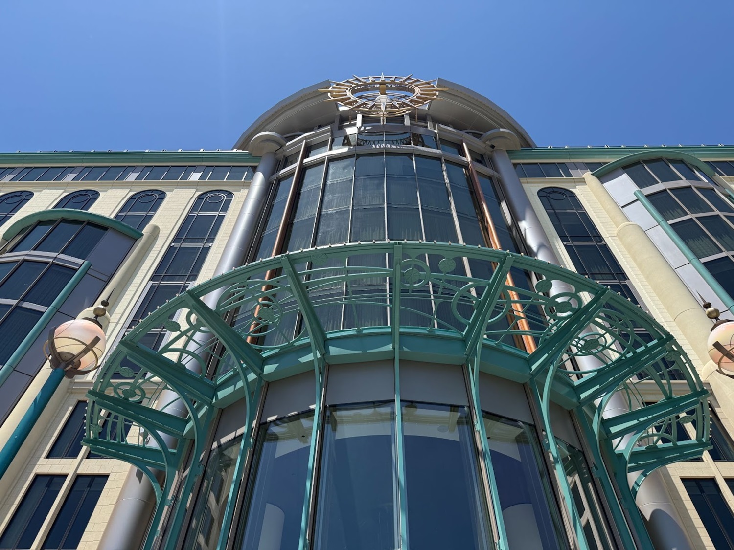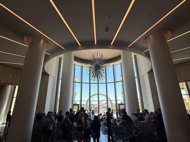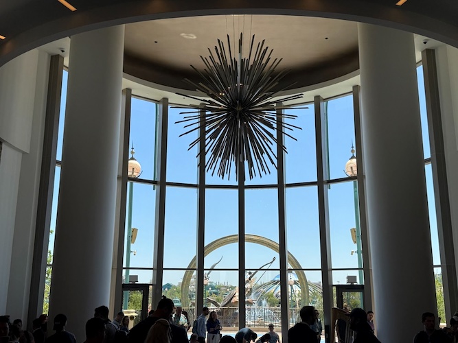 Laughing Place had the chance to check out the new Helios Grand Hotel as it began welcoming guests for the first time. The hotel, which is situated directly across the park from Epic Universe’s main entrance, is truly massive, featuring large copper domes as it curves inward and gently hugs the park. The hotel features a large glass column in the center that provides unobstructed views of the highly detailed lands of Universal’s newest theme park, which the lobby takes full advantage of.