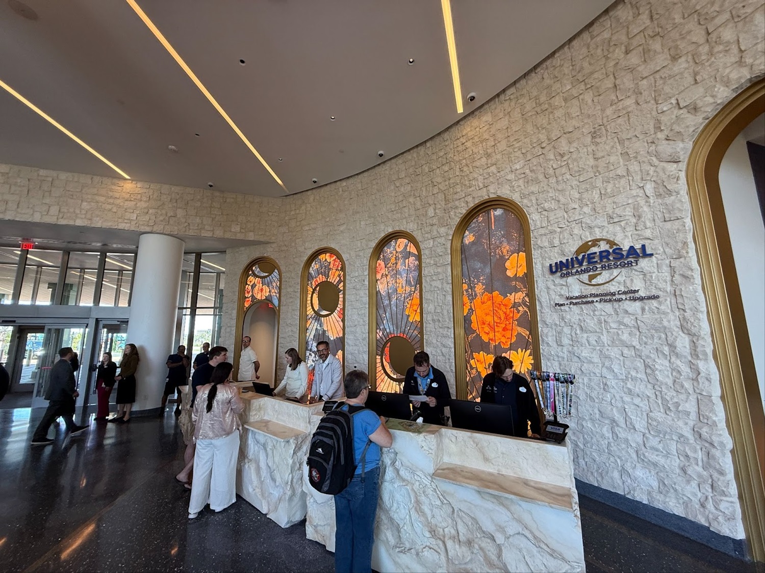 As you enter the lobby, the Florida sunshine floods the gold detailed atrium with copious amounts of natural light. To the right, you’ll find the check in area, which features colorful arched backdrops.