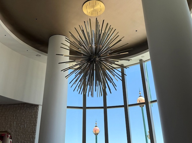 The ceiling is lined with LEDs arranged like sun rays, which draws attention to the lobby’s ginormous chandelier and panoramic windows.