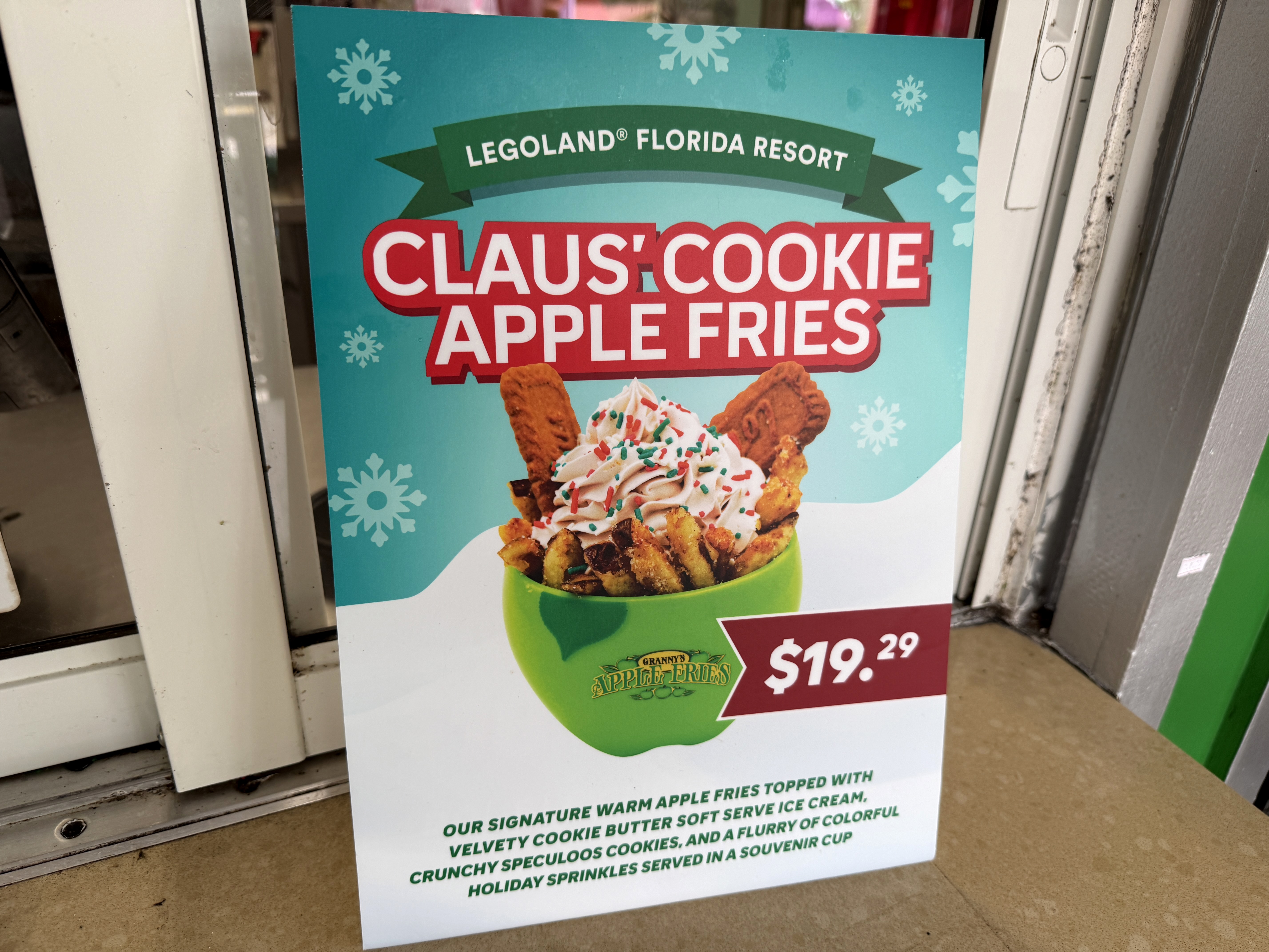 - Claus' Cookie Apple Fries (Granny's Apple Fries) – Signature warm apple fires, topped with velvety cookie butter soft serve ice cream, crunchy speculoos cookies, and a flurry of colorful holiday sprinkles, served in a souvenir cup.