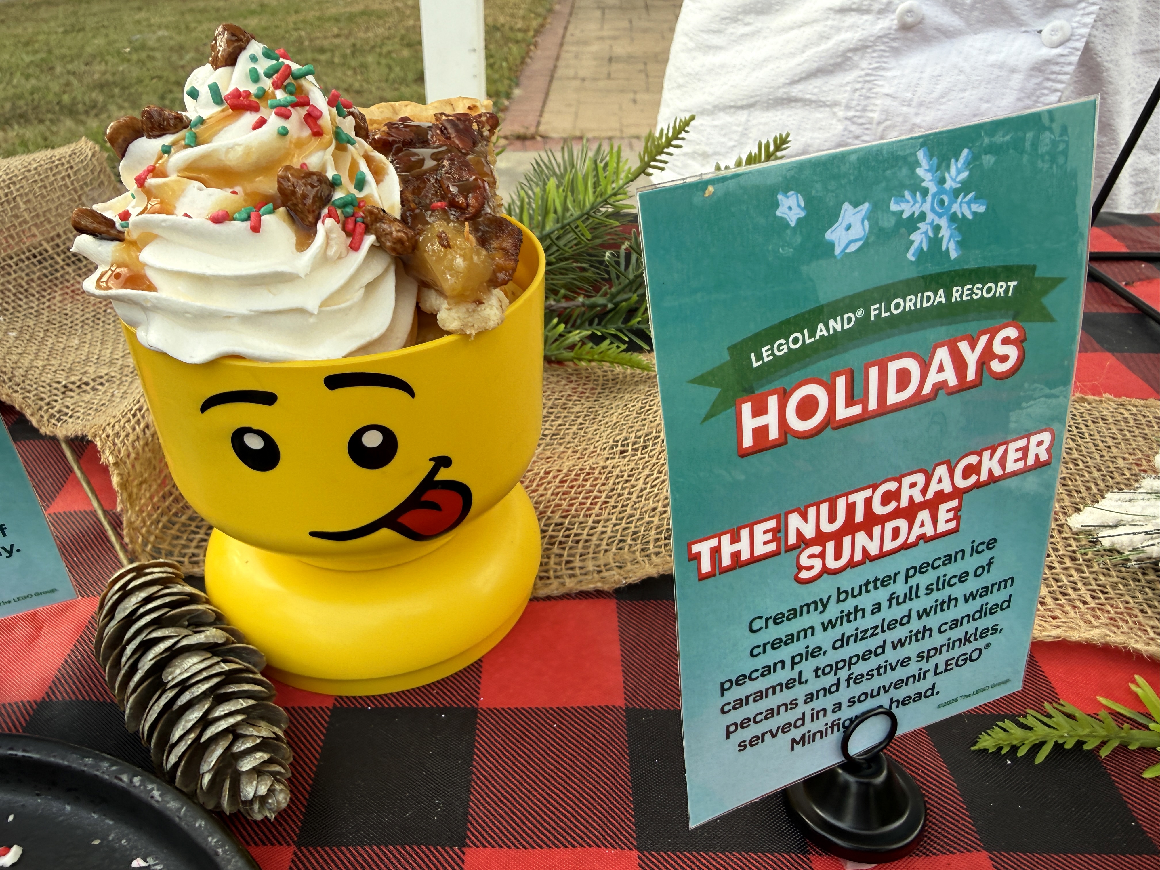 - The Nutcracker Sundae (Firehouse Ice Cream) – Creamy butter pecan ice cream with a full slice of pecan pie, drizzled with warm caramel, topped with candied pecans and festive sprinkles, served in a souvenir LEGO Minifigure head.