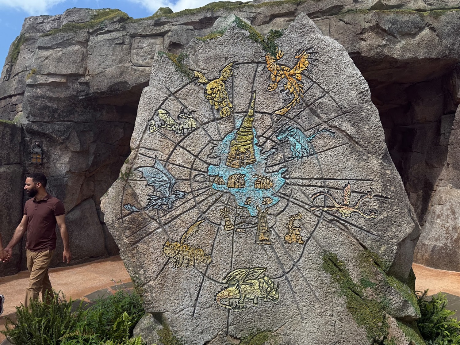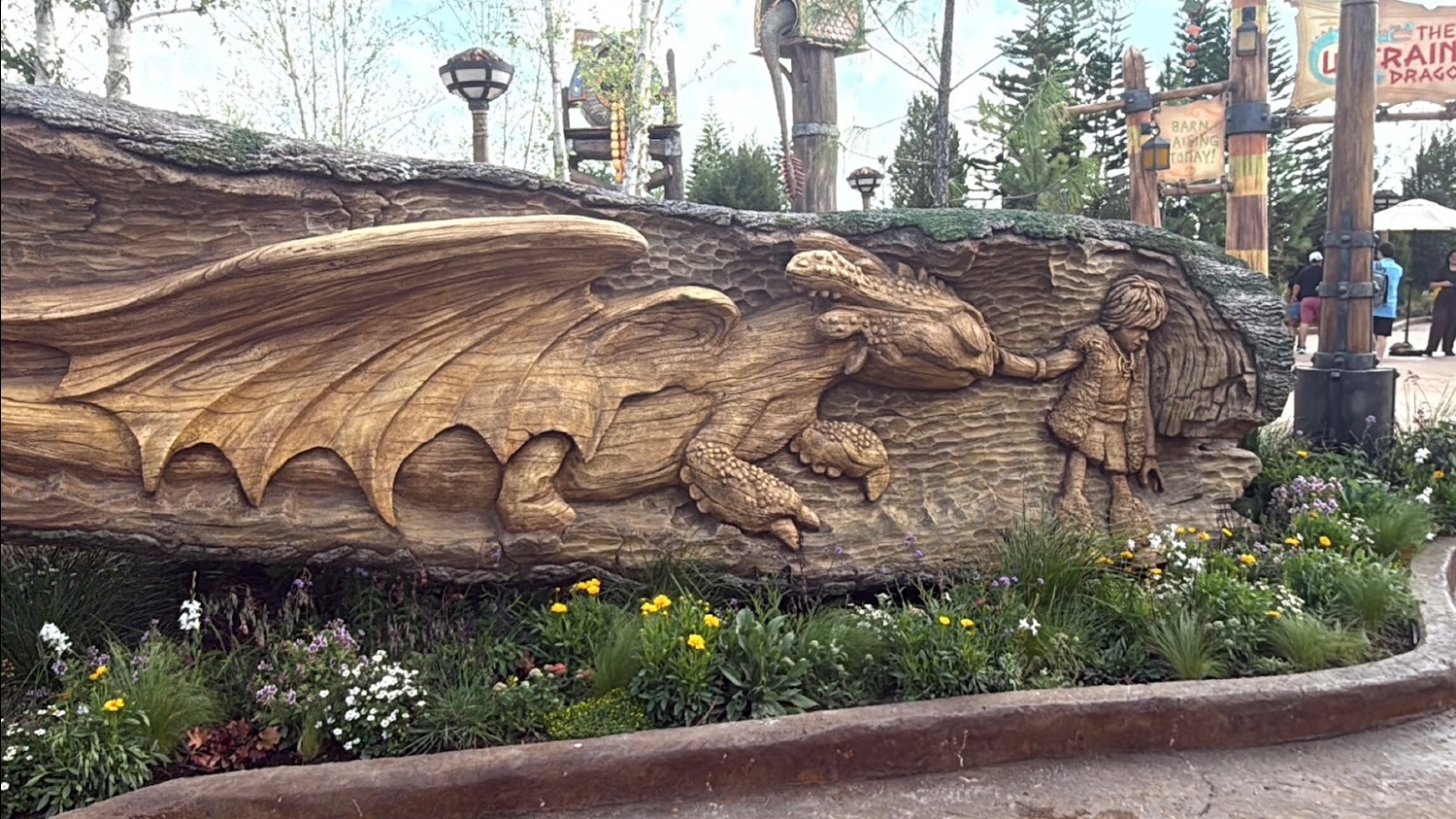This intricate carving of the film series’ main characters, Toothless and Hiccup, can also be found outside The Untrainable Dragon theater.