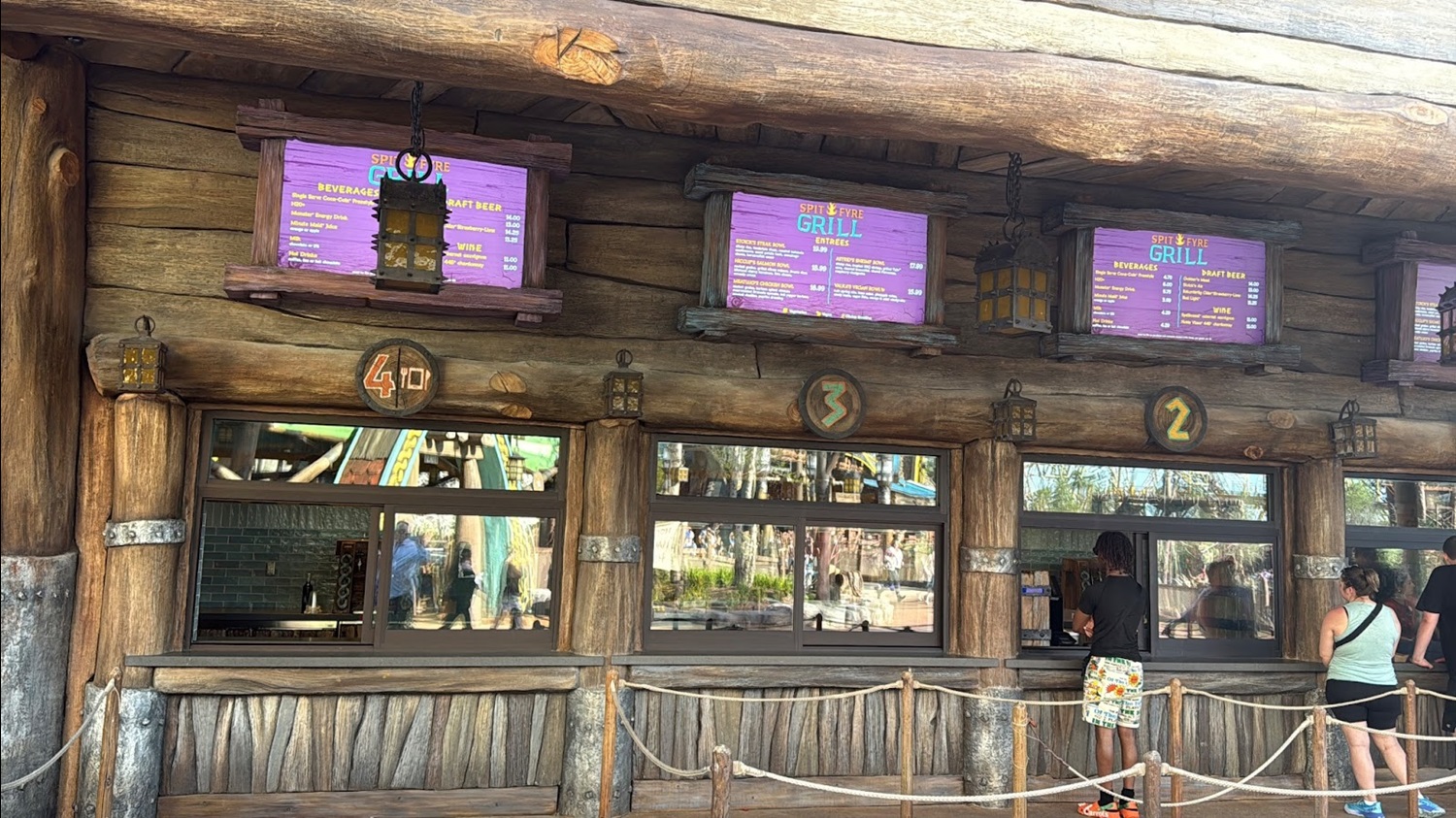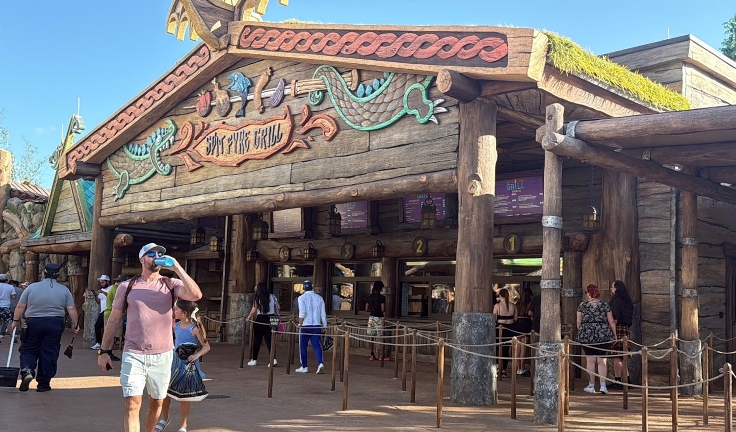 Overlooking the action of the Fyre Drill water attraction, Spit Fyre Grill is a quick-service dining location featuring delicious, hearty meals flame-seared by a helpful (unseen) dragon fry cook.