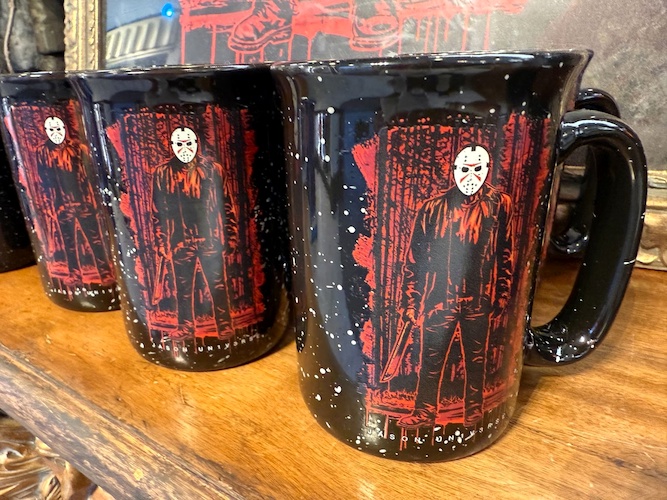 Items include a t-shirt ($33.00) and camping mug, both featuring the iconic shape of Jason Voorhees.