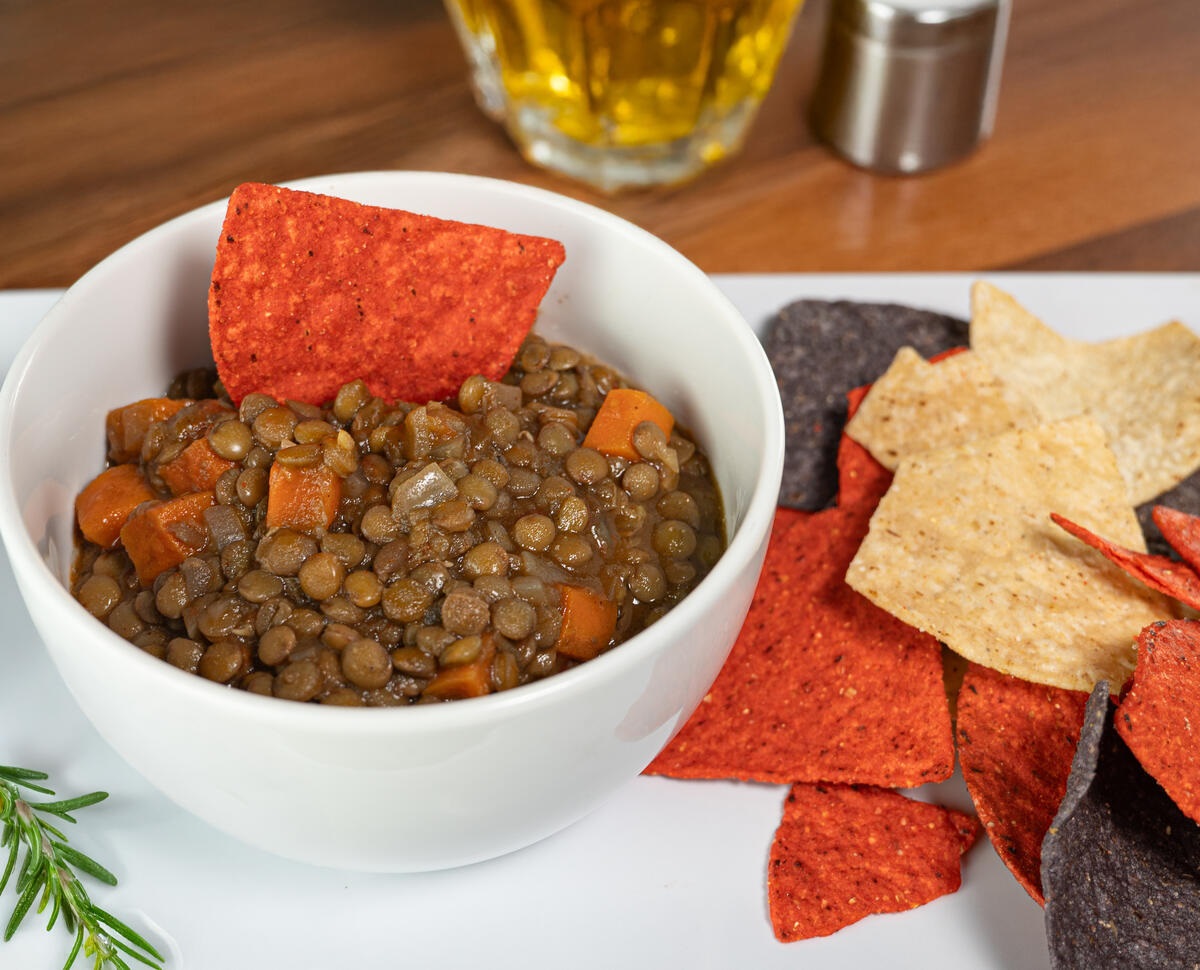 Lentil Chili with Crisp Tortilla Chips (Vegan)