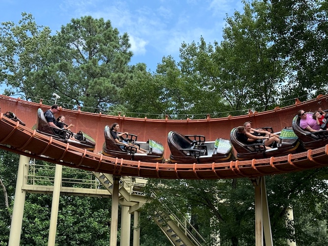Reptilian is part of a dying breed of coasters – the bobsled coaster. These were all the rage in the 1980s, which is when Reptilian (formerly known as Avalanche) was introduced. With the removal of the similar La Vibora at Six Flags Over Texas last year, Reptilian is now the only coaster of its kind left in the United States. Which is a shame, as these are fun rides! They’re called bobsled coasters, as they are not fixed to any guided track, instead making use of a wide trough. These rides tend to start off pretty tame, but pick up quite a bit of speed by the end of the ride. Add to that some great new theming introduced as part of the recent Jungle X-Pedition renovations, and you have a truly unique ride that I hope sticks around for years to come.