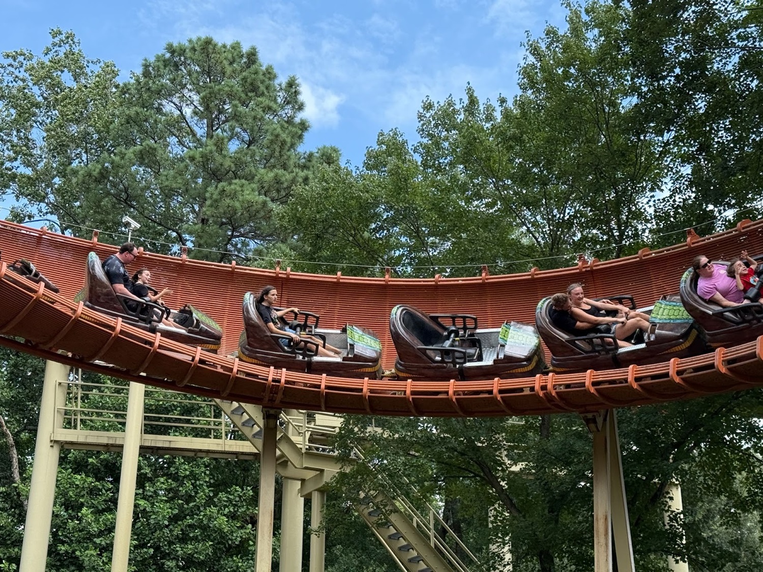 Reptilian is part of a dying breed of coasters – the bobsled coaster. These were all the rage in the 1980s, which is when Reptilian (formerly known as Avalanche) was introduced. With the removal of the similar La Vibora at Six Flags Over Texas last year, Reptilian is now the only coaster of its kind left in the United States. Which is a shame, as these are fun rides! They’re called bobsled coasters, as they are not fixed to any guided track, instead making use of a wide trough. These rides tend to start off pretty tame, but pick up quite a bit of speed by the end of the ride. Add to that some great new theming introduced as part of the recent Jungle X-Pedition renovations, and you have a truly unique ride that I hope sticks around for years to come.