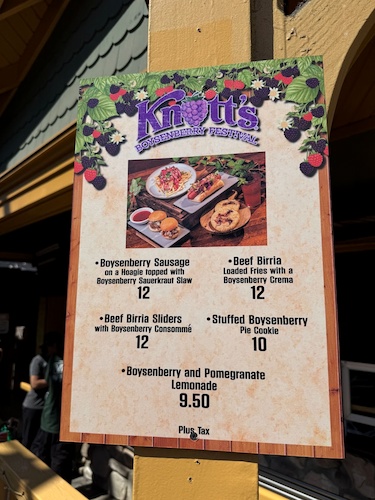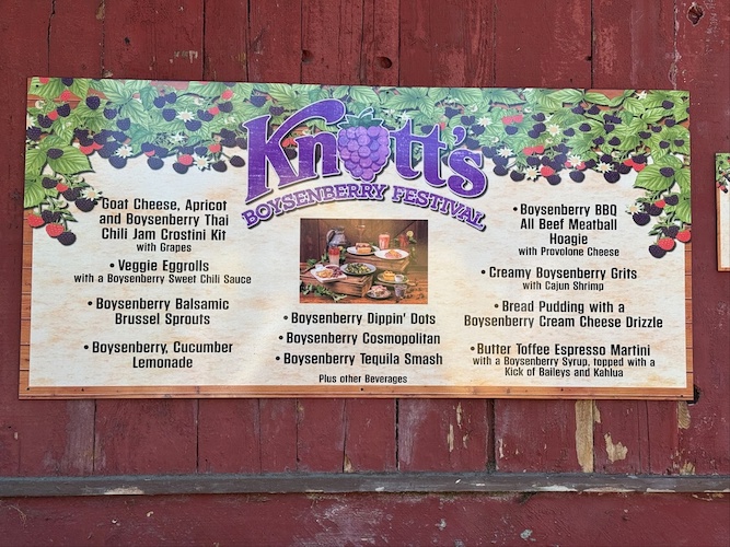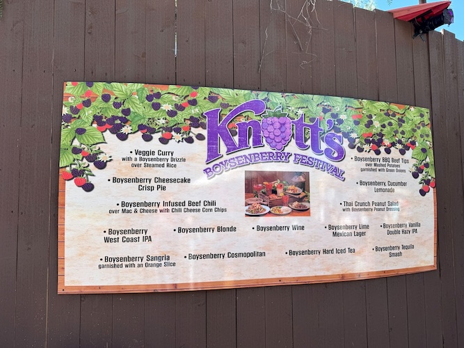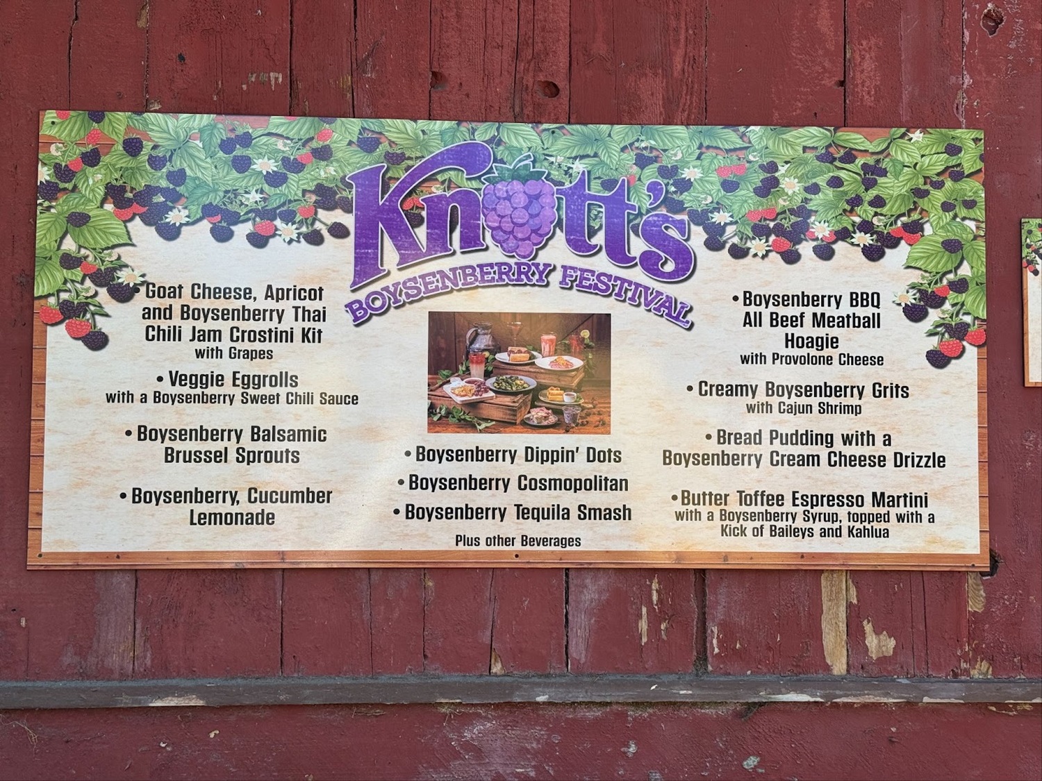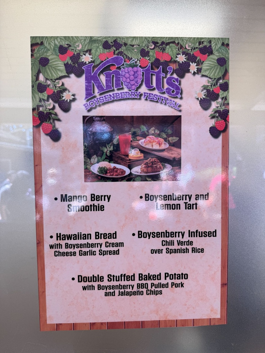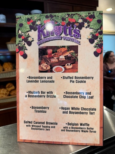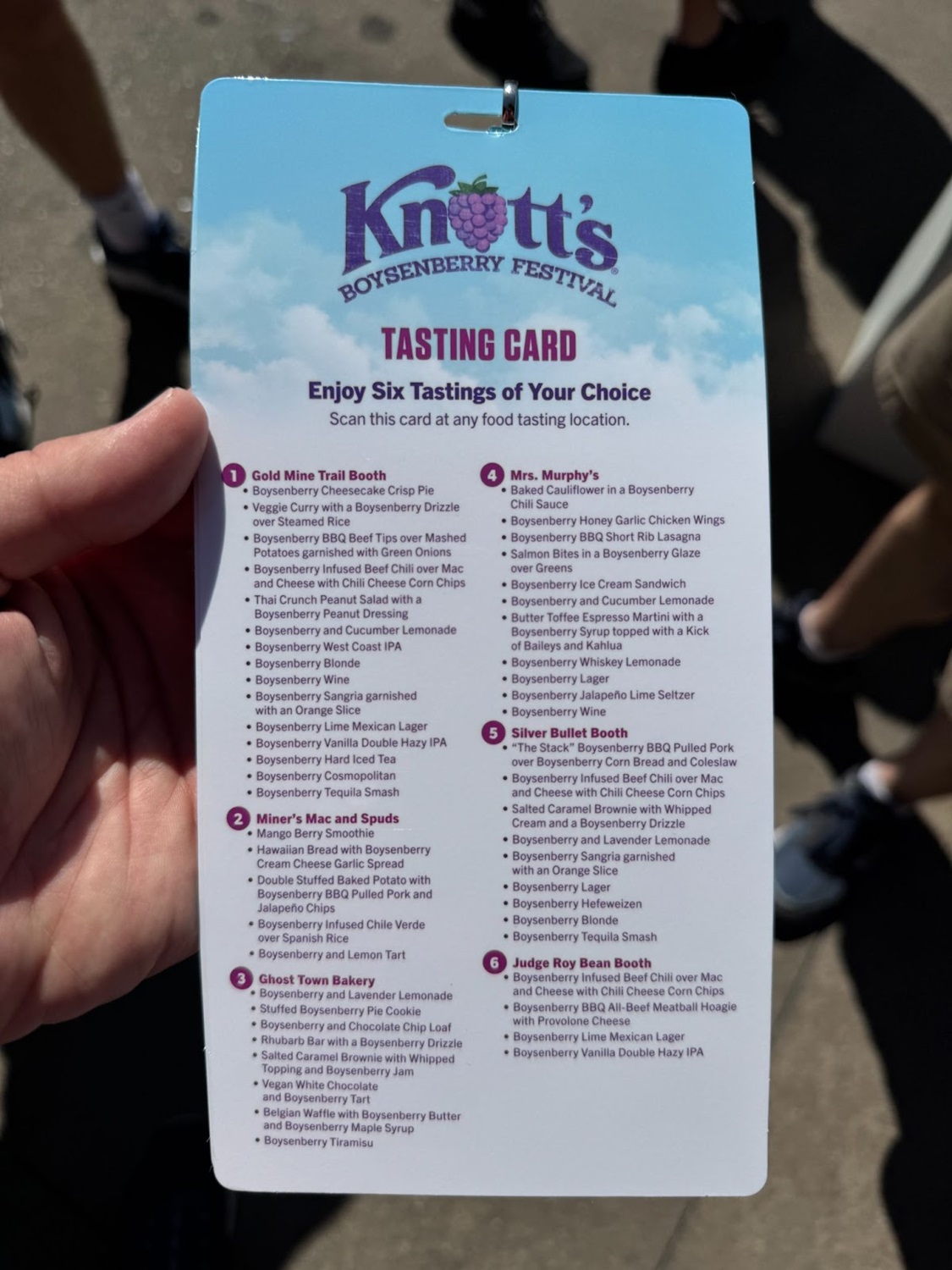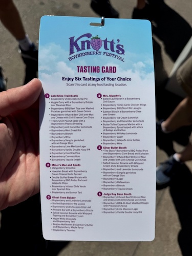 Here’s a look at this year’s Knott’s Boysenberry Festival tasting card, which Knott’s Berry Farm was kind enough to provide us with so we could try out some of the food and report back to our audience about what we thought.