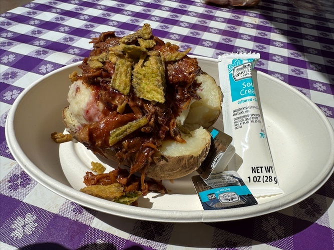 At Miner’s Mac and Spuds, we ordered the Double Stuffed Baked Potato with Boysenberry BBQ (“I like that there is an array of flavors, it’s a real boysen-adventure.") and the Hawaiian Bread with Boysenberry Cream Cheese Garlic Spread (“The cream cheese just does not go with the rest.")