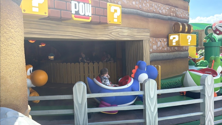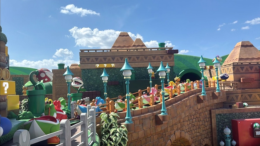 Guests ride on a Yoshii through the Mushroom Kingdom. The outdoor portions of this experience offer stunning elevated views of Super Mario Land.
