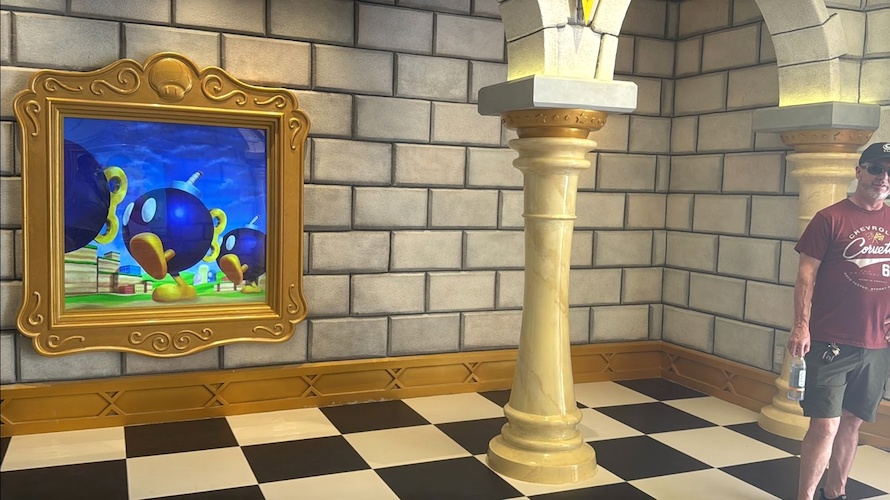 Like the start of Super Mario ‘64, you arrive inside of Peach’s Castle. The atrium features animated artwork you’ll swear you can use to jump into the game’s levels.