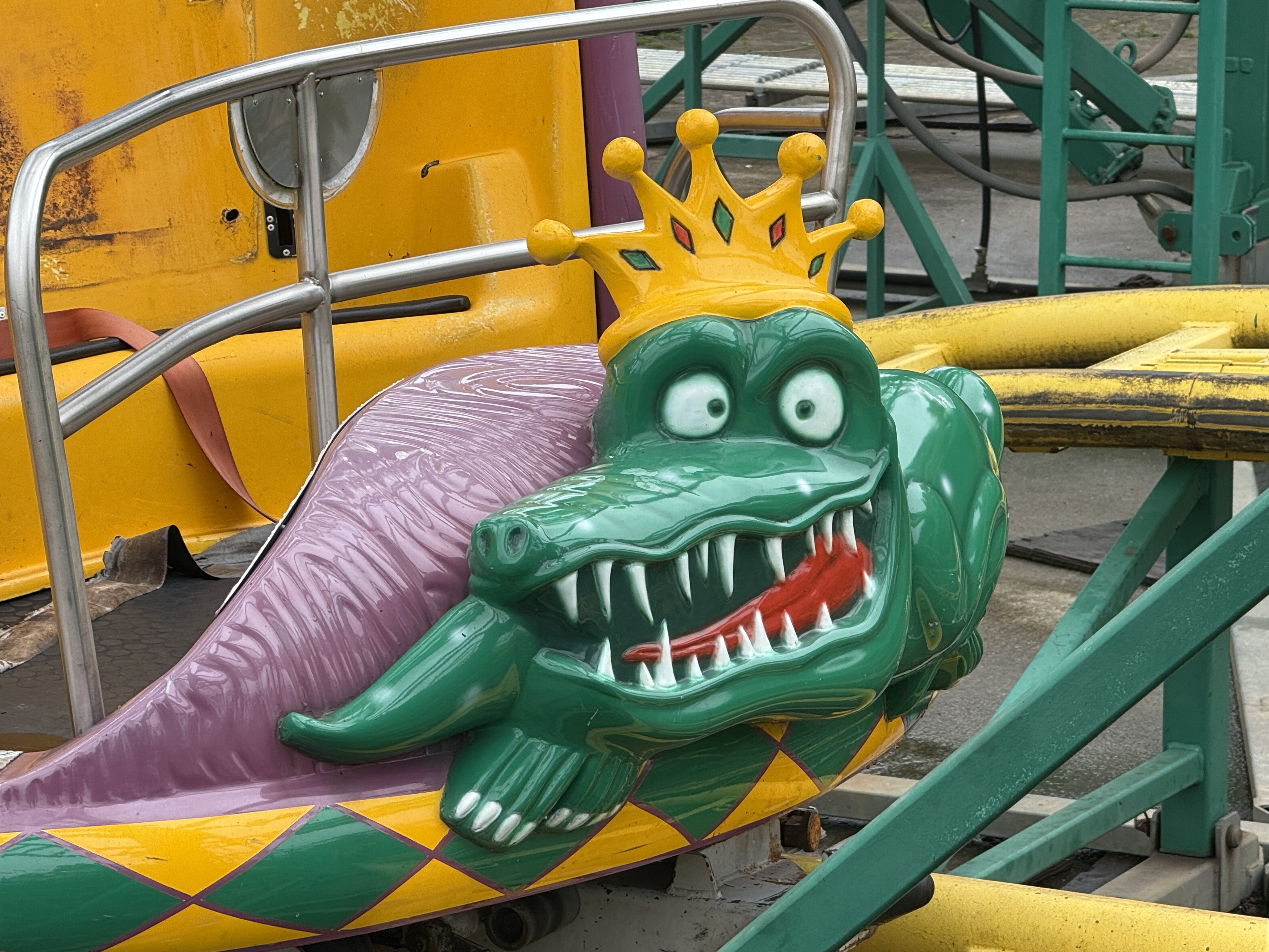 I had heard good things about Ragin' Cajun, the park's spinning wild mouse coaster that is pretty similar to the former Primeval Whirl at Disney's Animal Kingdom. What has been touted as its greatest strength, was for me its biggest downside. The coaster span way too violently for my liking, quite often slamming me from side to side. What I appreciated most about this coaster was its efforts at theming, such as the Mardi Gras loving gator seen above and the signage seen below.