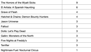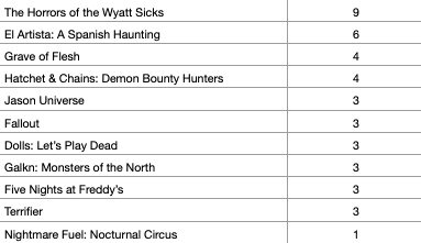 This year's event featured a very strong lineup of 10 haunted houses. The two standouts for me were The Horrors of the Wyatt Sicks and El Artista: A Spanish Haunting, which topped the list with nine and six experiences respectively. Five Nights at Freddy's and Terrifier were experienced less because of their consistently long wait times.