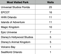 And before we get into the parks I visited most often, I of course need to acknowledge the fact that Orlando got a massive new theme park in 2025. Universal Epic Universe officially opened in May and I did visit multiple times. While that did impact this year's numbers, it likely won't sway them too significantly until Universal Orlando offers annual passes to the new park. At which point, you can expect Epic Universe to consistently be at the top of the following list...