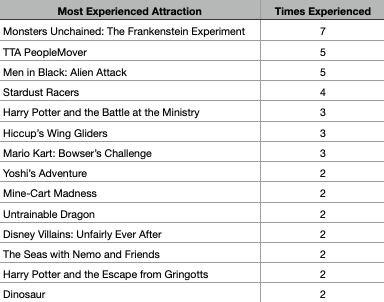 It is interesting though that seven appears to be the new magic number. After Men in Black: Alien Attack, the Walt Disney World Railroad and the TTA PeopleMover tied atop 2024's list with seven experiences each, Monsters Unchained topped this year's list with that same number.