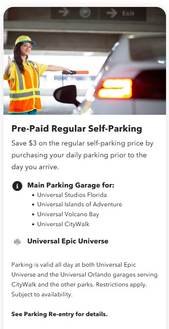 - The pre-paid parking discount is also valid at the separate Universal Epic Universe parking lot.