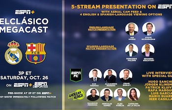 ESPN Announces MegaCast for the Real Madrid-FC Barcelona ElClásico Oct 24, 2024 1:14 pm (Pacific) Maxon Faber