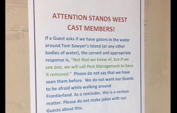 Are There Gators in WDW? “Not That We Know Of…” According to a Since-Removed Backstage Instructions Jul 15, 2016 2:11 pm (Pacific) Laughing Place Disney Newsdesk