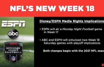 ABC and ESPN Go Over New Details With the Addition of a Week 18 in the NFL Mar 30, 2021 12:20 pm (Pacific) Laughing Place Disney Newsdesk