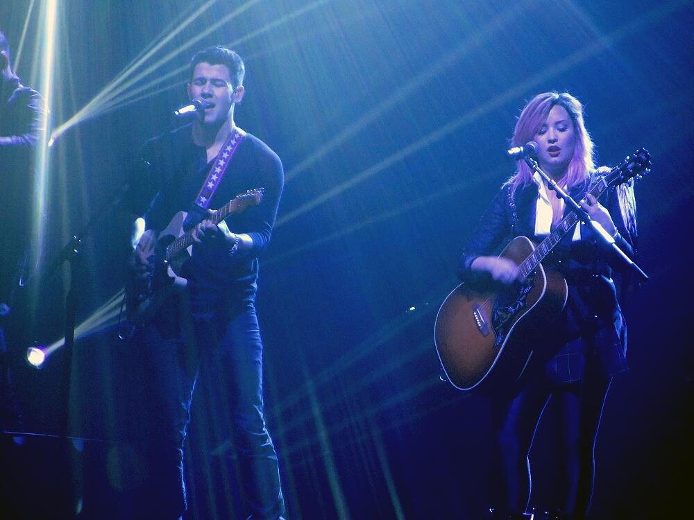 With just a few shout-outs to the audience between songs, she raced through a series of lesser-known tracks from all four of her albums. The stage showed off its impressive capabilities during “Fire Starter,” where the neon tubes surrounding the band and projections made the stage appear to be on fire. During “Really Don’t Care,” a duet from her most recent album, she displayed the first sign that she’s 21 and no longer the girl you remember from Camp Rock. The lyric goes “Now if we meet out on the street I won’t be running scared, I’ll walk right up to you and put one finger in the air.” And she did. That finger. Aimed at the audience. While most people would be offended at receiving such a gesture after paying for the show, Demi’s Lovatics (the name her legion of fans prefer to go by) cheered at the sight. At our show, she replaced one lyric with the “B-word” and used that word again to describe the amount of resilient girls in the audience that night. At her opening night in Vancouver, she dropped the “F-bomb,” so parents of younger Demi fans should be prepared for a PG-13 show.With a change of pace, Demi took a seat and was joined by an old friend, Nick Jonas, as the audience lost it. While this may be an overstatement, the cheers felt like they lasted at least a minute before quieting down. While playing acoustic guitar, Nick joined Demi in singing three songs, including her 2009 hit “Here We Go Again.” That power ballad was transformed into an upbeat acoustic duet, taking on a quality reminiscent of “As Long as We’ve Got Each Other” from Growing Pains.