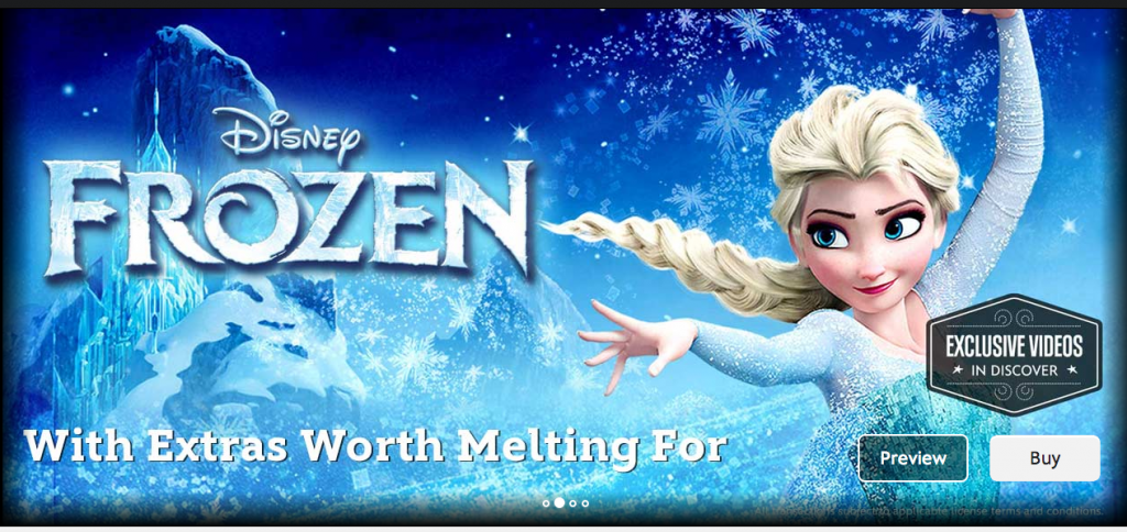 I was initially confused by the ads for Frozen and Thor: The Dark World on the main page. Both ads say "Exclusive Videos in Discover." This lead me to believe that buying Frozen would unlock exclusive content that can't be found anywhere else. While the DMA version of Frozen does include a few bonus features, none are exclusive. What this really means is that if you navigate to the 'Discover' section of the site, there are some bonus videos that relate to Frozen and Thor that you won't find anywhere else. Anybody can watch them, regardless of content purchased.