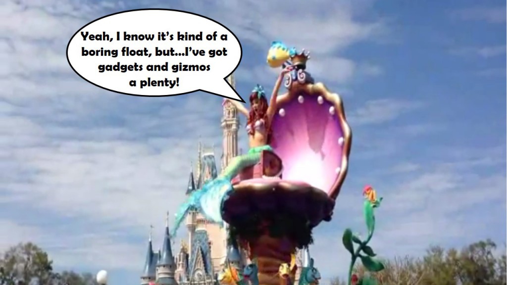 The Little Mermaid float seems like the odd one out in this parade. It’s gorgeous and everything, but puny in comparison to the other floats. While some wicked cool parade performers dance around in their seashell and sea horse outfits, Ariel is just dinglehopper-ing it up as she brushes her hair and flips her tail while everyone along the parade corridor (don’t you kind of wish that phrase was still a thing) yawns and waits for the fire. That is not a euphemism for Merida’s hair.