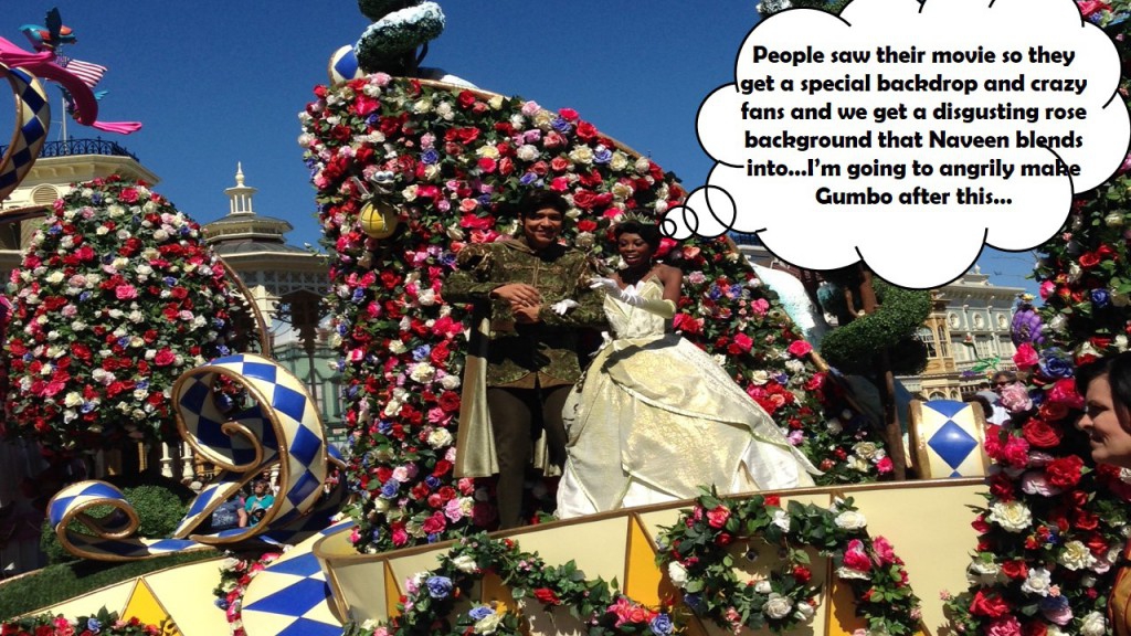 It starts with the Tokyo import float, showcasing various princesses and their soul mates in a rose garden. Whether or not the Imagineers’ heads were cut off when painting the roses red is still not known. You’ve got your Belle & Beast. You’ve got your Cinderella & Prince Charming. The end of the float is a mix between Tiana & Prince Naveen and Elsa & Anna (with a semi-creepy Olaf for good measure), yet I don’t feel like Tiana appreciates it…