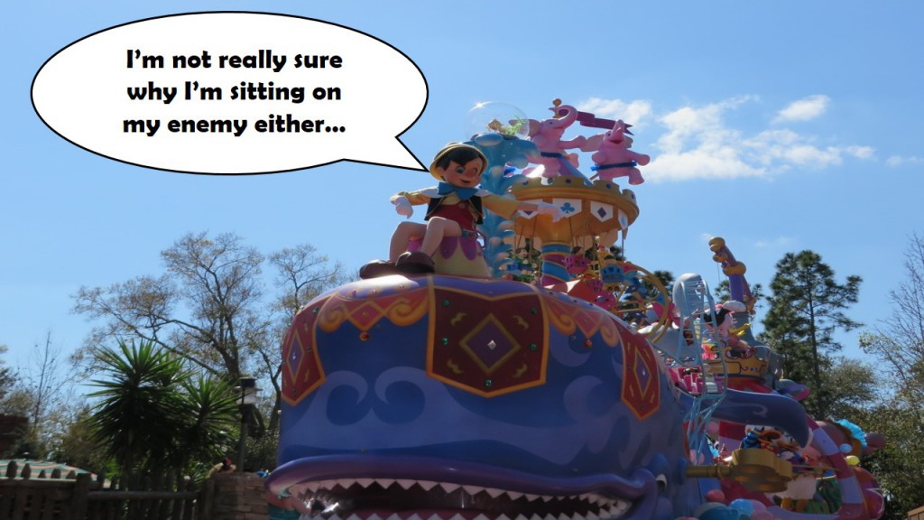 Then Peter Pan comes out and is all “I win.” with his magnificently complex float. It towers over his competitors the rest of the parade and Main Street with the Pirate Ship/Rainbow/Skull Rock/Captain Hook questioning his life choices/Tinkerbell holding up the rear combo. It is remarkable that we had to deal with a shiny Castle float for who knows how many years (heck, after this happened, they should’ve burned the dang thing) and yet, this is what they COULD have been giving us.