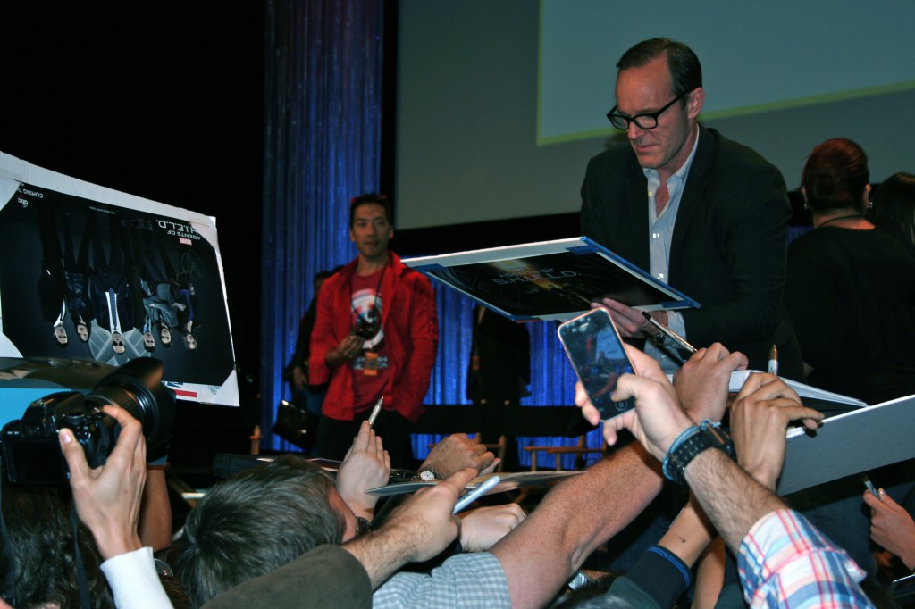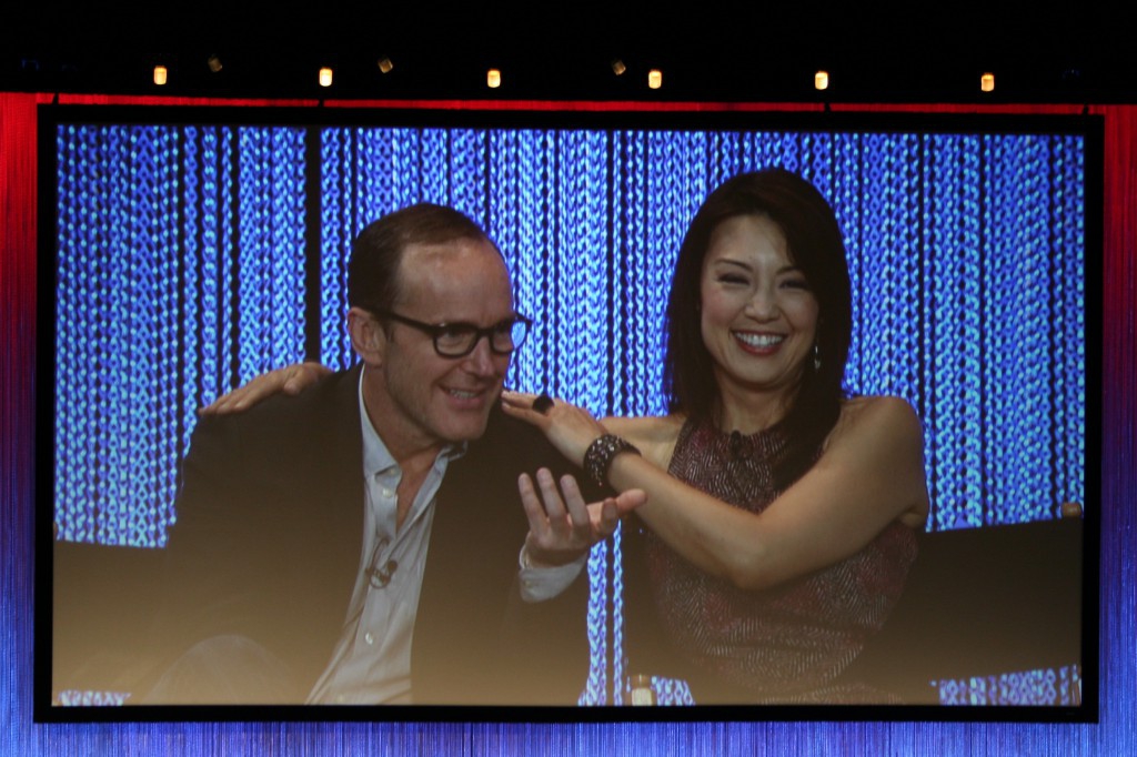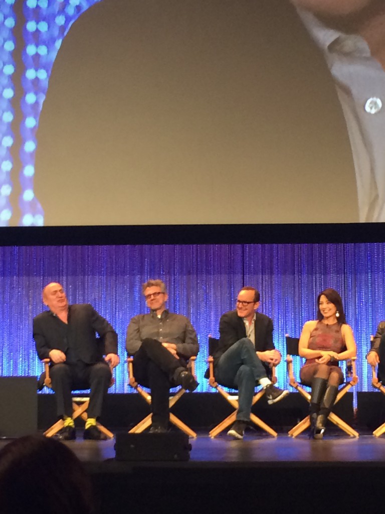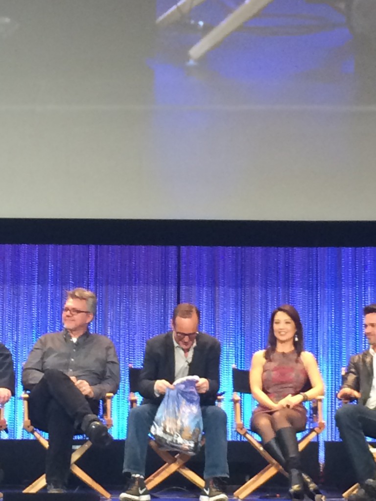 Time was spent discussing the Coulson Lives movment which sprung up on social media following the S.H.I.E.L.D.’s agent death in Marvel’s The Avengers. Clark Gregg loved playing the character and was heartbroken about his demise. Jeph Loeb told a story of how Clark tried to convince him to bring Coulson back in a TV series before Marvel’s The Avengers was released. Jeph responded by saying that the world needed to know Coulson died before they could bring him back. He also teased that Clark started the #CoulsonLives phenomenon on twitter. Clark joked, “I can now confess that I have 11,000 Twitter aliases, all of whom were very integral to starting the #CoulsonLives movement.”