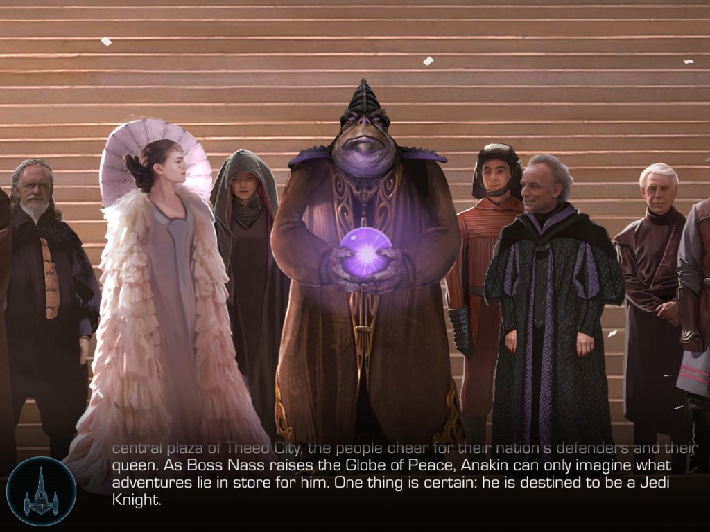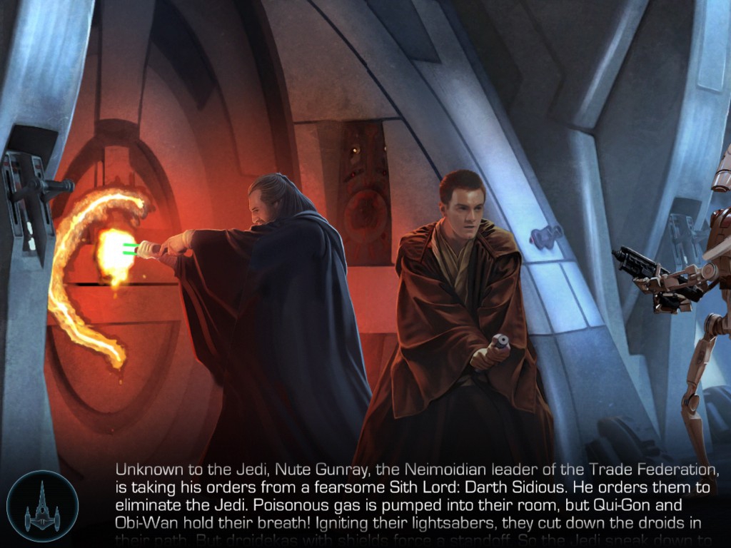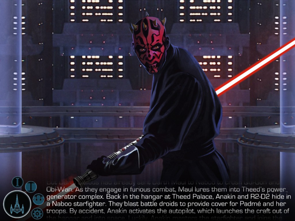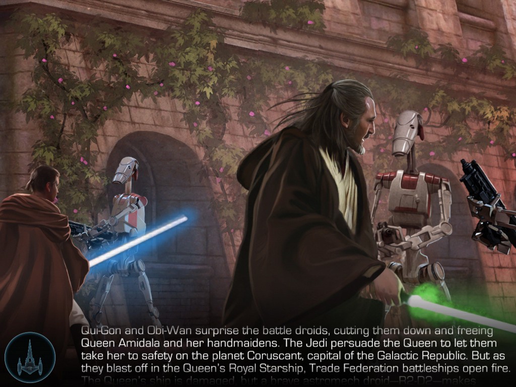 This app can most easily be described as the next generation of interactive storybooks. If you're my age, you no doubt remember those little Disney records that came with a story book. A narrator, music, and sound effects brought the story to life, and "Don't forget to turn the page when you hear Tinkerbell's chimes ring, like this..." Imagine that...on steroids!Let's start with the actual story of the Phantom Menace. Like those old Disney records, the narrator is joined by both music and sound effects. The music is pulled right from the Episode I soundtrack, and the sound effects are all right out of the film, adding a nice level of authenticity to the story.