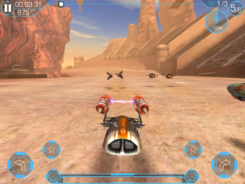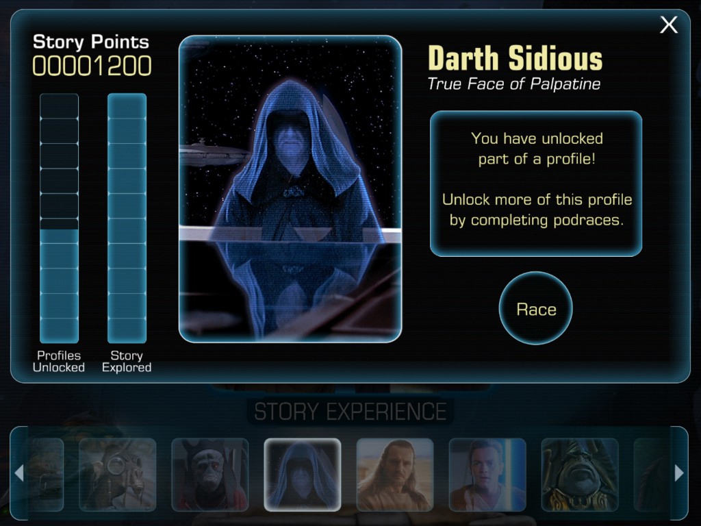 And then there are the Podraces, which may be the best part of this entire app. There are different Podracers for you to choose from, and each can be customized with different colors and designs. There are also a ton of different tracks ranging from easy to HOLY COW! You steer the Podracer either by touching the screen or tilting your device left or right. And as you win races, you'll unlock additional content making for an even deeper story experience.