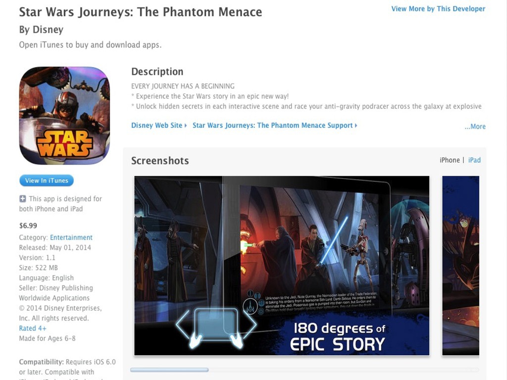 In the coming months Disney will be releasing more chapters in the Star Wars Journeys series covering all six films. This is a great way to get kids up to speed on the Star Wars story before Episode VII hits theaters next year. Star Wars Journeys: The Phantom Menace can be found on the iTunes App Store in the Kids and Entertainment categories. For what you get here, I'd say that the $6.99 price tag is right on point. I enjoyed it, and more importantly my kids enjoyed it, and are still playing with it.