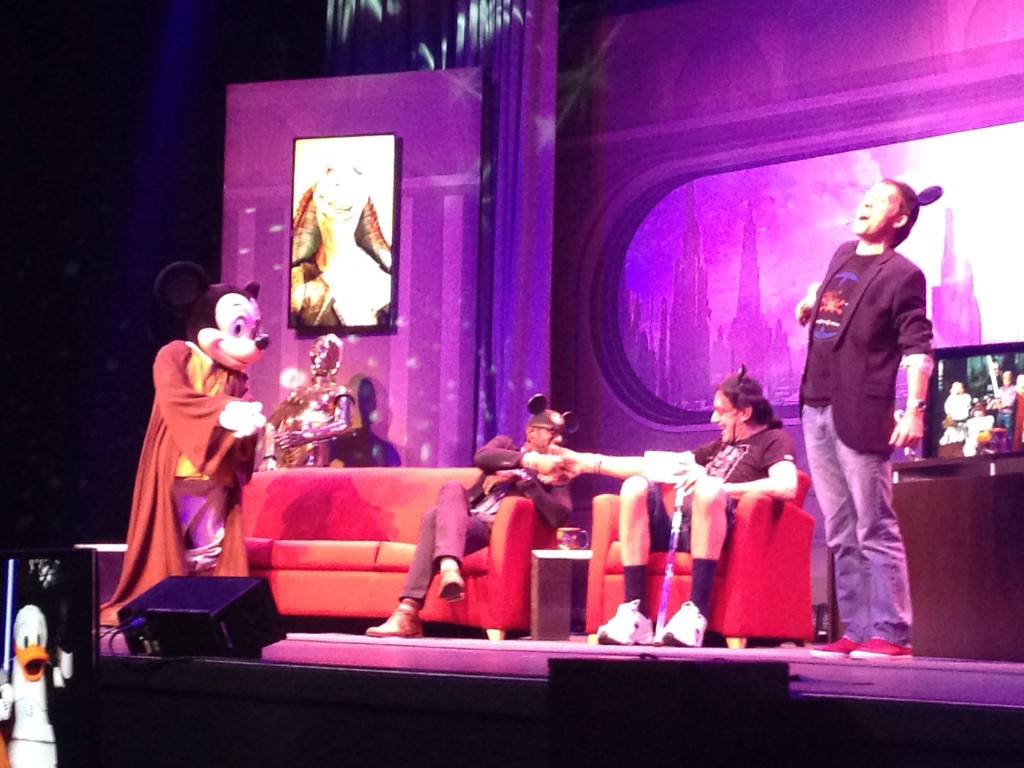 Jedi Mickey, Ahmed Best, Peter Mahew, and James Arnold Taylor about to sing off from Stars of the Saga.