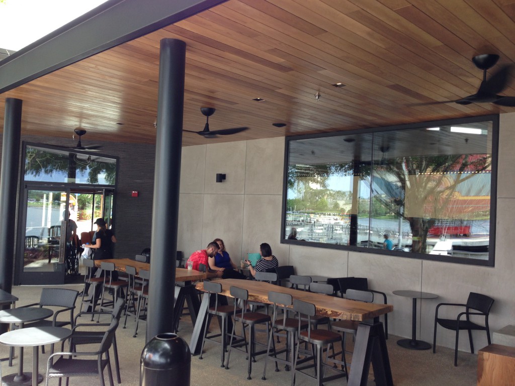 While I am not a big coffee drinker, this is a location will be a place many will go to just sit and enjoy at any time of the day or night. Hours will be, as of right now, 10am - midnight with a beautiful back patio with a fireplace for those "cold" florida nights. Also notice the benches and tables made from reclaimed wood and the live moss logo above the fireplace.