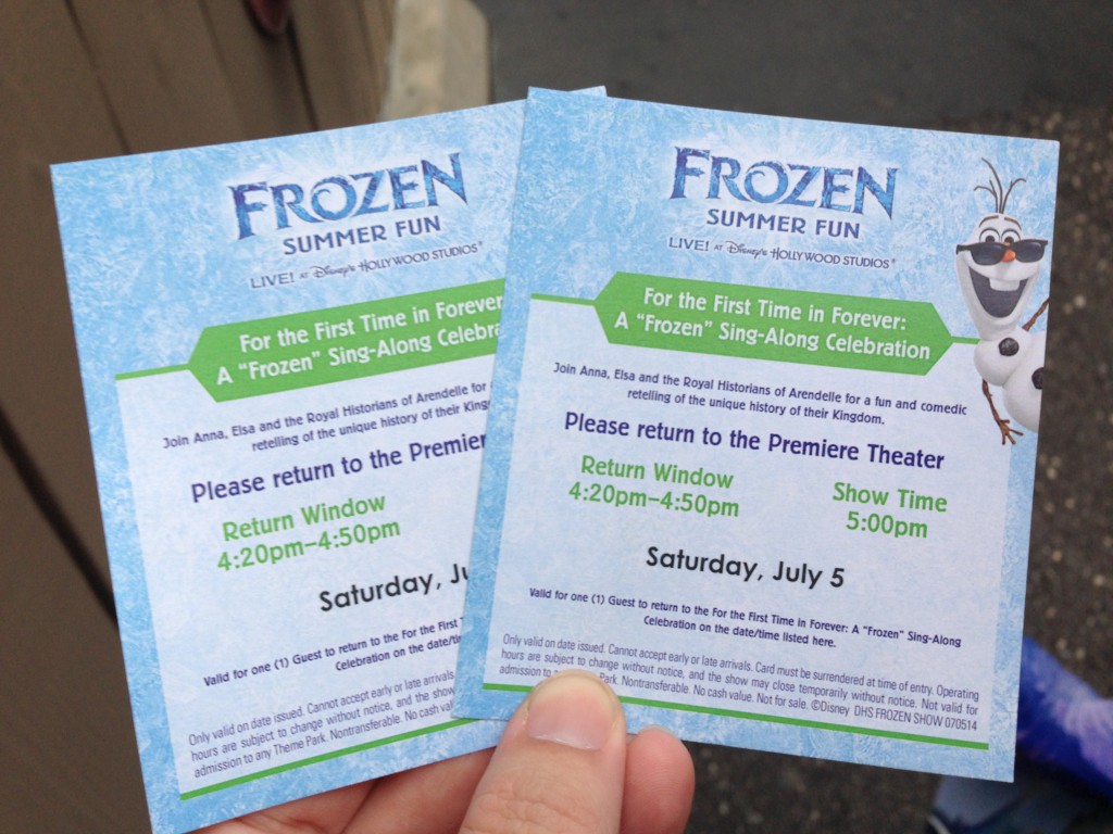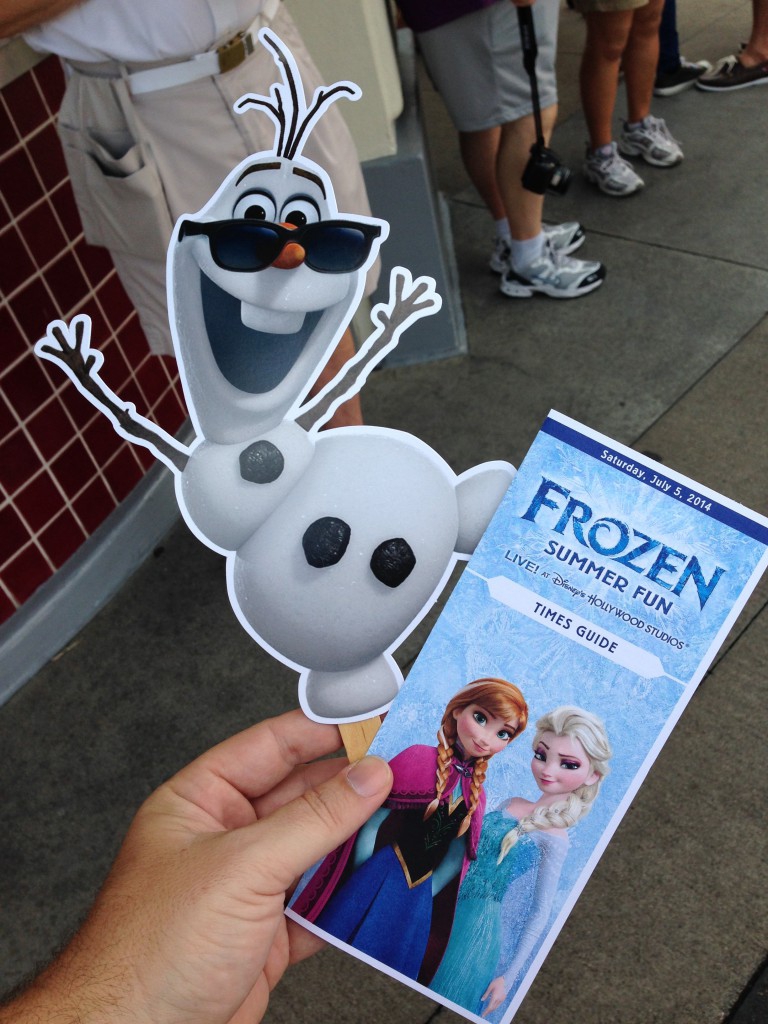 As soon as you enter the park you are giving the times guide showcasing all the Frozen events and other goings on in the park and a "flat Stanley" type Olaf that you are encouraged to take photos with and use the hashtag #OlafSummerVacation that might be shown later in the evening before the Frozen Fireworks.