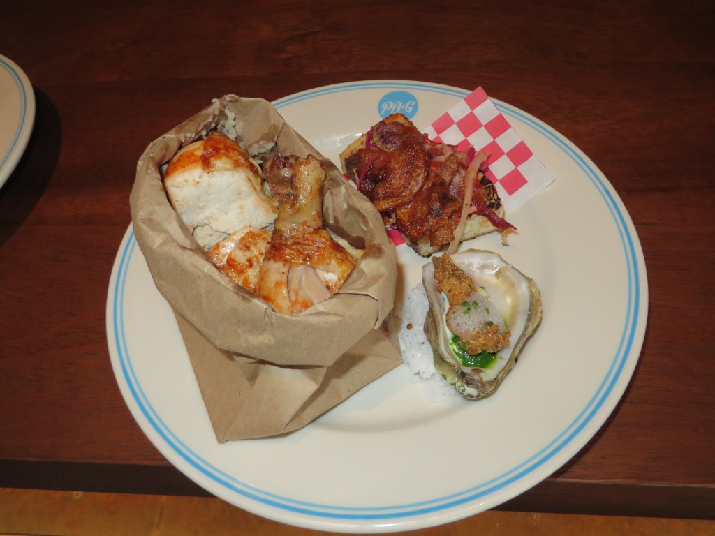 The other offerings at PB&G included a perfect beef brisket with sauerkraut coleslaw on rye, a bag of rotisserie chicken so good it fell off the bone with a picnic perfect potato salad, and something I never thought I would say...a very tasty Oysters "roc" a fella with spinach puree, smoked aioli and bacon breadcrumbs.