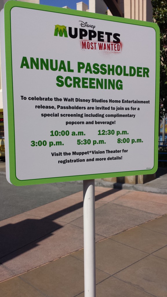 One of the many perks of being a Disneyland Resort Annual Passholder is having the opportunity to attend exclusive events. No matter how big or small they may be these events are always a good time, and this one was no exception. On Tuesday August 12th the resort hosted exclusive AP screenings of Muppets Most Wanted in celebration of the Blu-Ray combo pack release of the film. The screenings took place inside of the Muppet Vision Theater in Disney's California Adventure. Beginning at 9am Annual Passholders could check in with friendly cast members to receive a wristband for their preferred screening time. Color coded wristbands were distributed for the five movie times listed at both the entrance of the park and entrance of the theater. We chose to attend the 12:30 pm screening so we had time to grab a few fastpasses and have lunch.