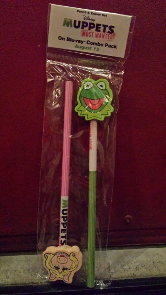 Upon returning to the theater we were given a pack of Kermit the Frog and Miss Piggy pencils and welcomed in to the theater. Once inside the pre-show area we were greeted by cast members behind vending carts distributing our free popcorn and soda. Refreshments in hand, we shuffled into our seats and within minutes the show began. A cheerful host came out to get the crowd excited and involved by asking a variety of trivia questions, rewarding correct answers with a Muppets Most Wanted Blu-Ray combo pack. Questions ranged from the very simple, such as naming characters based on personality traits, to the more challenging, such as naming composers and directors used for Muppets films.