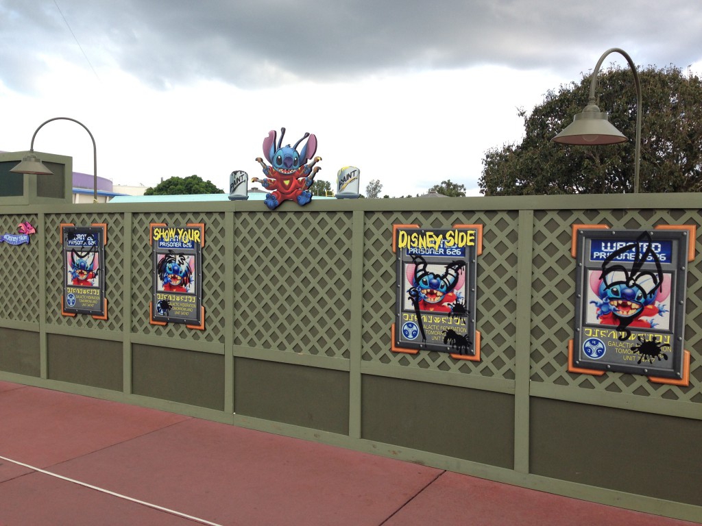 As we head into Tomorrowland we see that Stitch has been helping with his Wanted signs to show his #DisneySide along the walls and the paint job for the Astro Orbiter is coming along.