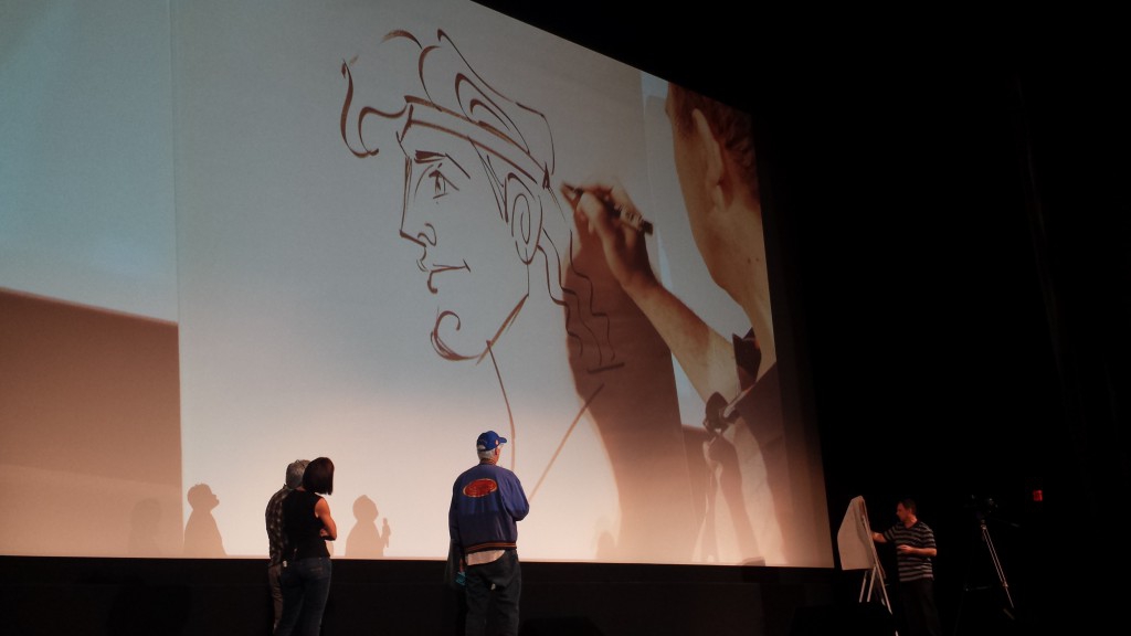 Susan's favorite part of playing Meg was getting the body she always dreamed of, thanks to Meg's animator Ken Duncan. Ken didn't have much to say other than how fun it was to animate such a sassy character. Shortly after, Hercules' animator Andreas Deja came to the stage and crossed directly over to an easel set up on stage left. Deja has animated some of my favorite characters, most notably Gaston, so the fan in me was beyond excited at the chance to watch him sketch right in front of me. He talked us through the character design of Hercules, first sketching out the somewhat goofy looking original concept, then sketching out the final design of the Hercules we all know and love. Smiles were seen throughout the audience as the group left the stage and Musker and Clements introduced the Goofy short The Olympic Champ and the feature film we were all there to see, Hercules.