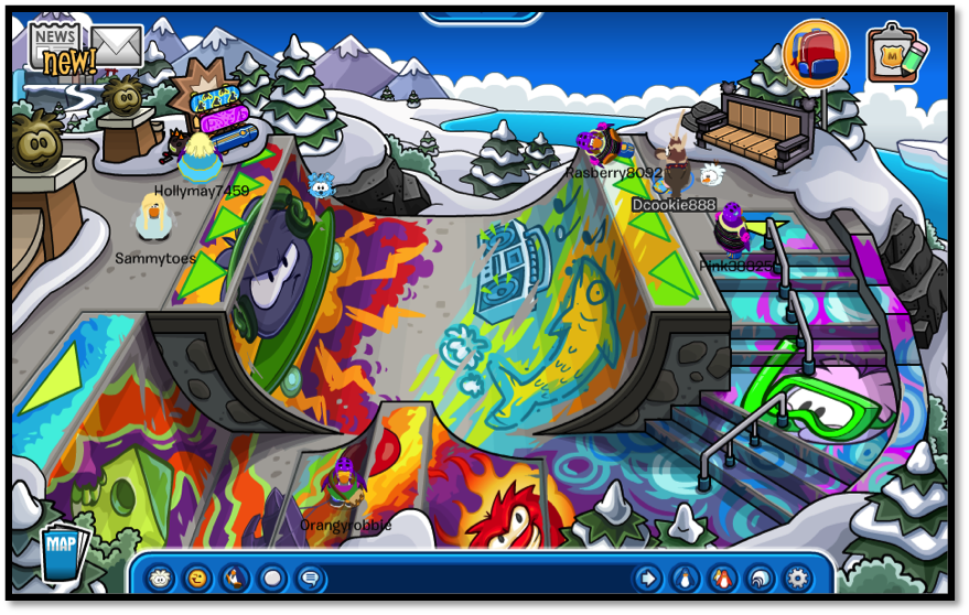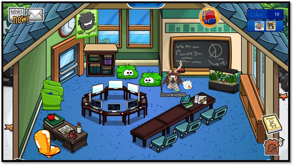 A new skate park has been constructed with a sick half-pipe where Penguins are donning pro-helmets and flashy new skater threads while carving until their hearts are content. Do not be alarmed, “sick” is a way of paying a compliment to something that is well… cool. There are even stairs with rails so penguin-skaters can practice grinding with their new boards that they collect during the scavenger hunt. The scavenger hunt quest for the back to school party is all about cleaning up the school after Rookie makes a big mess while he prepares to throw a grand back to school party. Players are directed to different areas to “clean up” by clicking on items that are causing mayhem and safety concerns everywhere. Spilled paint, sandwiches and science beakers – someone will get hurt if we don’t pick it all up! During the scavenger hunt, players are rewarded with new skateboards, skater threads, pro-helmets and even a school house igloo! Schoolhouse furniture items and skater clothes are also available in the new September catalogs. Check out Dcookie888’s new schoolhouse igloo that he has decked out with new computer desks and puffle beanbags.