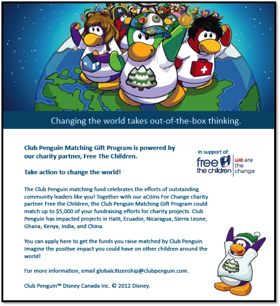 Below, Information about the Club Penguin Matching Gift Program in partnership with Free The Children