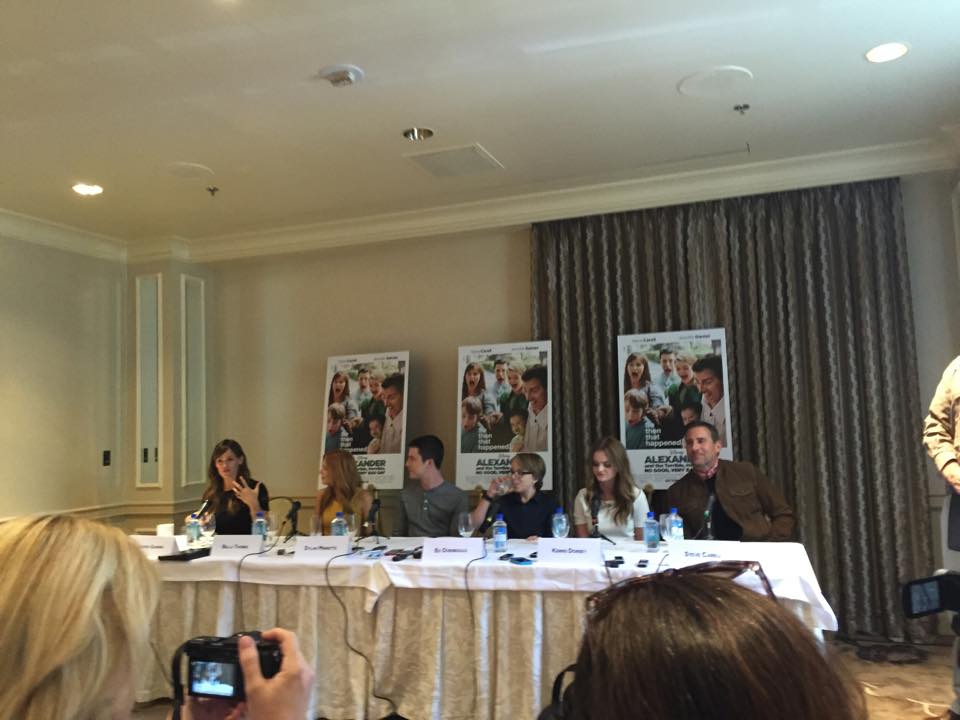 After the creative team left the room, we had a few minutes to stretch before the cast came in to talk and answer questions. This included Steve Carell, Jennifer Garner, the actors who play their three kids (Ed Oxenbould, Dylan Minnette and Kerris Dorsey), and Disney Channel star Bella Thorne. When asked if any of the cast had bad days on set, Jennifer Garner stepped up to describe a miserable day shooting outdoors on location with high heat. Steve Carell instantly started mocking her answer and you could tell this cast really enjoyed working together. The kids talked about how easy it was to feel like a family because they all got along so well. Ed, who plays Alexander, is from Australia and it was interesting to hear him speak with his natural accent after hearing him nail our American accent so perfectly in the film. Jennifer Garner also talked about how amazing it was to work with Dick Van Dyke during his cameo in the film. Bella Thorne also shared how hard it was to play a mean character.