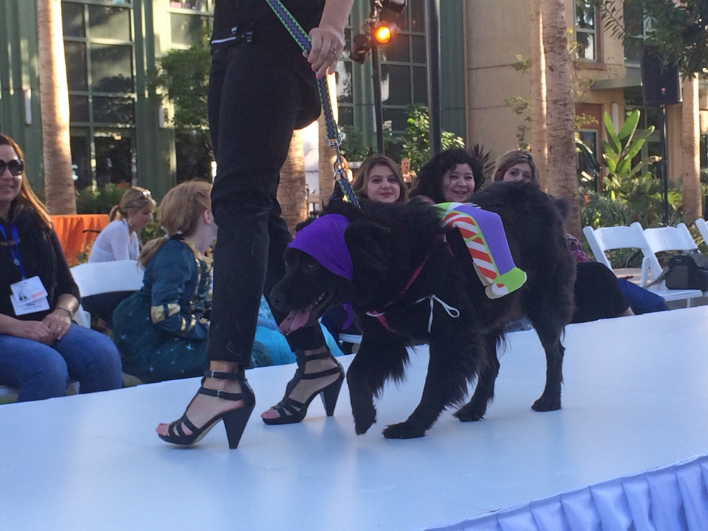 The final act of the fashion show was all about canine cartoon couture. That’s right. Costumes for your dogs. And, darn it, they were adorable. All of the model dogs were up for adoption from the local shelter, which I thought was a lovely touch. The puppies sported outfits modeled after Winnie the Pooh (with a little plush bee on the rump!), Spiderman, Princess Leia, and Buzz Lightyear. The costumed fit a variety of dog sizes, ranging from a tiny puppy to, well, a very large puppy. They could not have looked sweeter!